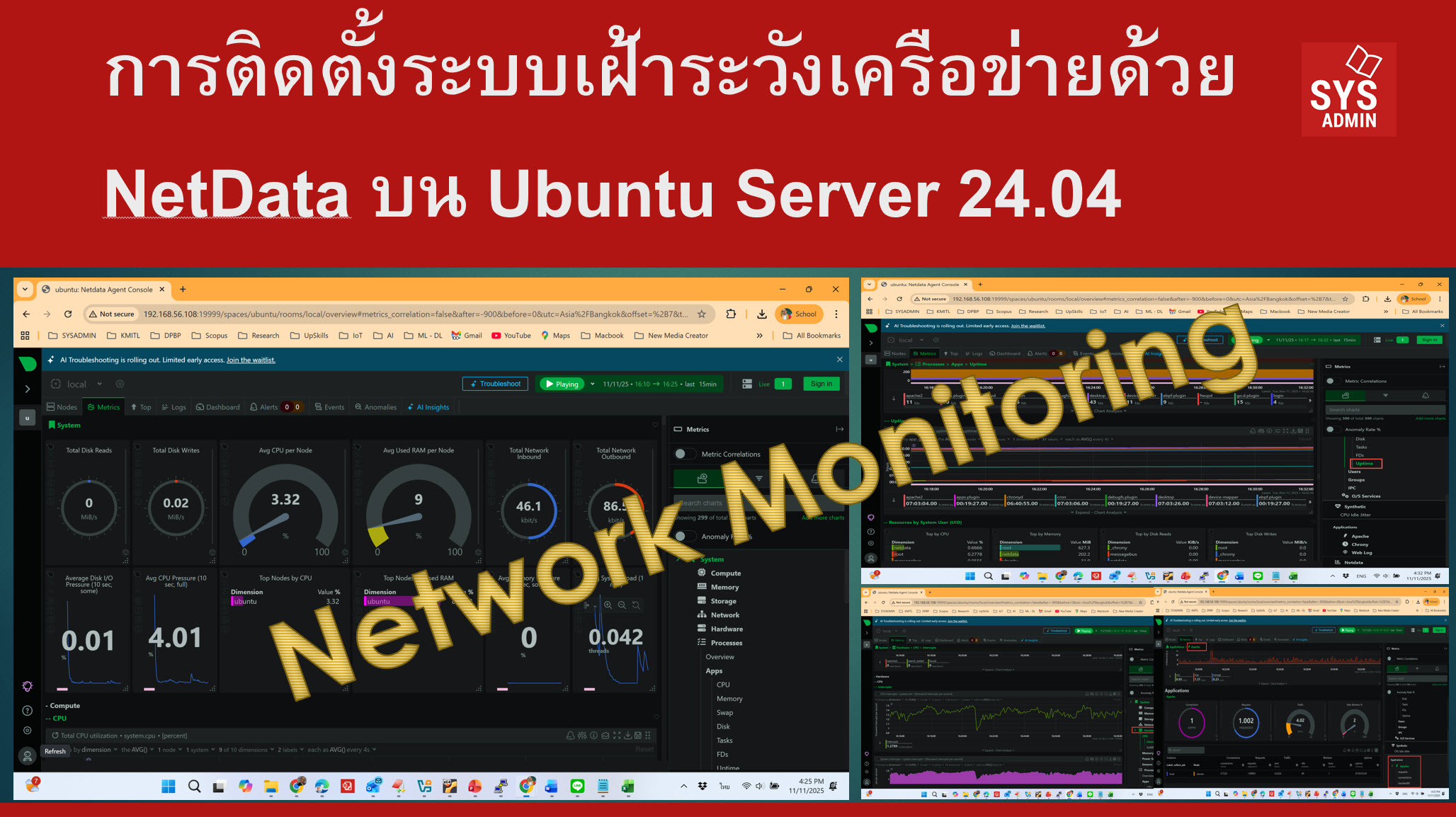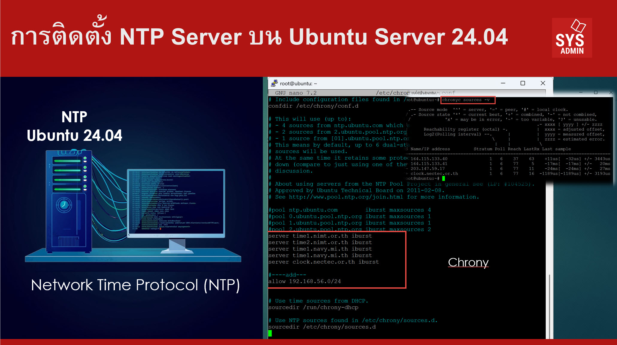 ในระบบเครือข่ายคอมพิวเตอร์ ความถูกต้องของเวลาเป็นสิ่งสำคัญอย่างยิ่ง โดยเฉพาะในระบบที่มีการประมวลผลแบบกระจาย (Distributed Systems) หรือระบบที่ต้องการความสอดคล้องของเวลาระหว่างเครื่องแม่ข่ายและเครื่องลูกข่าย เช่น ระบบฐานข้อมูล ระบบเฝ้าระวังความปลอดภัย และระบบเครือข่ายองค์กร การตั้งค่าเวลาให้ตรงกันในทุกเครื่องจึงเป็นภารกิจที่สำคัญ ซึ่งสามารถทำได้โดยใช้ NTP (Network Time Protocol) บทความนี้จะอธิบายขั้นตอนการติดตั้งและตั้งค่า NTP Server บน Ubuntu Server 24.04 LTS โดยใช้ซอฟต์แวร์ Chrony ซึ่งเป็นซอฟต์แวร์ที่ได้รับความนิยมสูงในปัจจุบัน เนื่องจากมีความแม่นยำสูง ใช้งานง่าย และใช้ทรัพยากรระบบน้อย…