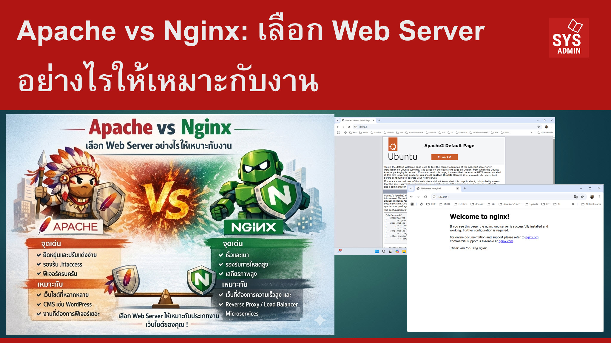 การเลือก Web Server ไม่ใช่แค่ “ตัวไหนดัง” หรือ “ตัวไหนเร็วกว่า” แต่คือการเลือก “สถาปัตยกรรมการทำงาน” ให้เหมาะกับรูปแบบทราฟฟิก แอปพลิเคชัน ทีมงาน และแผนการขยายระบบในอนาคต ระหว่าง Apache และ Nginx ทั้งคู่เป็นตัวเลือกที่แข็งแรง ใช้จริงในงาน Production มายาวนาน แต่มี “จุดเด่นคนละแบบ” ถ้าเลือกให้ถูก งานจะนิ่งขึ้น เร็วขึ้น และดูแลง่ายขึ้นอย่างชัดเจน Apache vs Nginx…