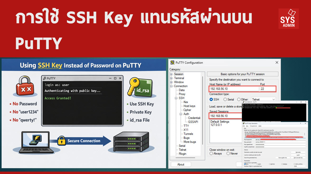 ในการดูแลระบบเซิร์ฟเวอร์ ไม่ว่าจะเป็น Linux Server, Cloud VM หรือ IoT Gateway ความปลอดภัยในการเข้าถึงระบบถือเป็นหัวใจสำคัญ การใช้รหัสผ่าน (Password Authentication) แม้จะสะดวก แต่มีความเสี่ยงต่อการถูกเดา (Brute Force) หรือรั่วไหลได้ง่าย แนวปฏิบัติที่ผู้ดูแลระบบมืออาชีพเลือกใช้คือ SSH Key Authentication ซึ่งมีความปลอดภัยสูงกว่าอย่างมีนัยสำคัญ บทความนี้จะอธิบาย การใช้งาน SSH Key แทนรหัสผ่านบน PuTTY อย่างเป็นขั้นตอน…