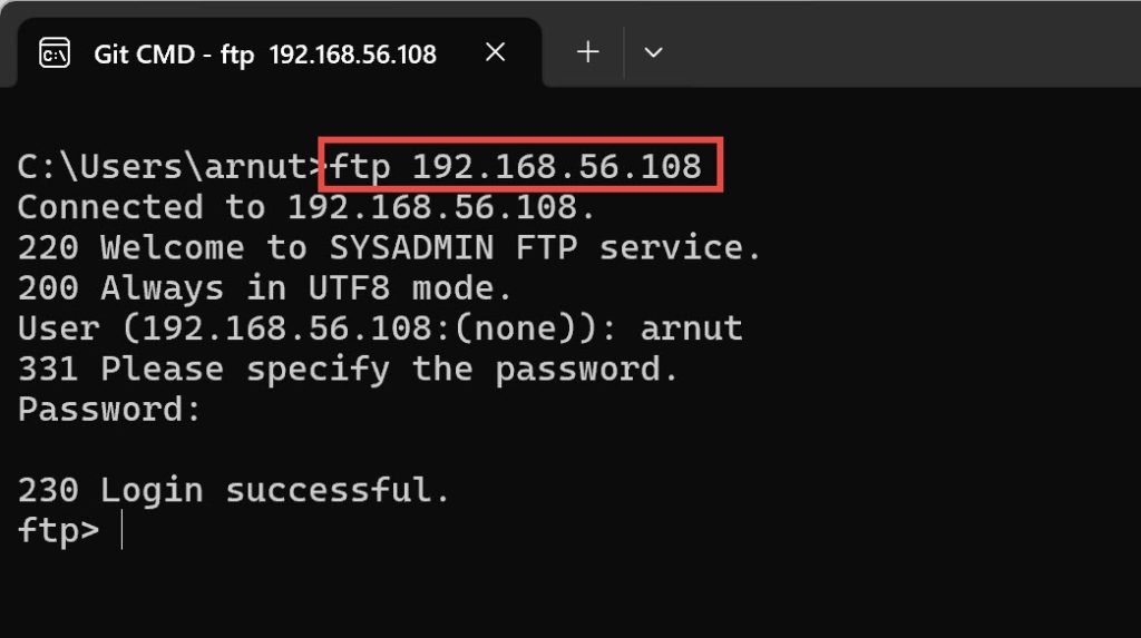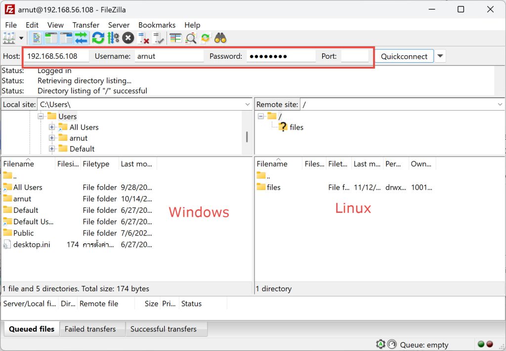 จากนั้นทดสอบการเชื่อมต่อผ่าน FTP Client เช่น FileZilla หรือใช้คำสั่ง FTP ภายในระบบอื่น