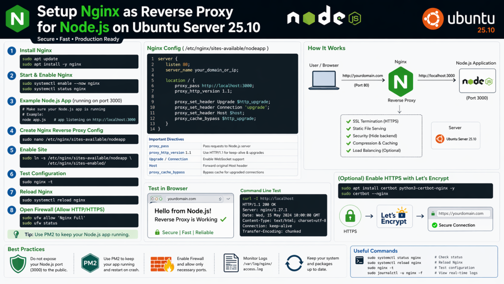 การใช้ Nginx เป็น Reverse Proxy สำหรับ Node.js เป็นแนวทางมาตรฐานที่ช่วยเพิ่มทั้ง ความปลอดภัย ประสิทธิภาพ และความยืดหยุ่นของระบบ โดยผู้ใช้จะเชื่อมต่อผ่าน Nginx (port 80/443) แทนที่จะเข้าถึง Node.js โดยตรง ทำให้สามารถจัดการ SSL, Load balancing และ Security ได้ง่ายขึ้น