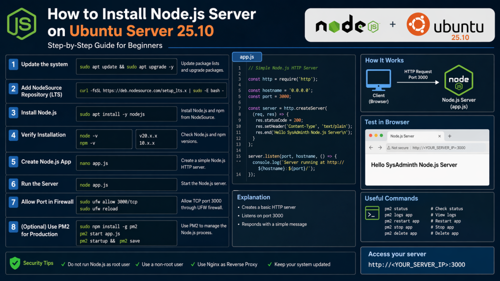 บทความนี้แนะนำการติดตั้ง Node.js Server บน Ubuntu Server 25.10 ตั้งแต่การเตรียมระบบ ไปจนถึงการทดสอบใช้งานจริง โดยเน้นให้สามารถ Copy → Paste → ใช้งานได้ทันที พร้อมคำอธิบายทุกขั้นตอน