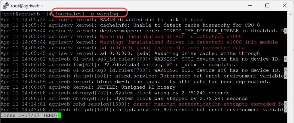 journalctl -p warning