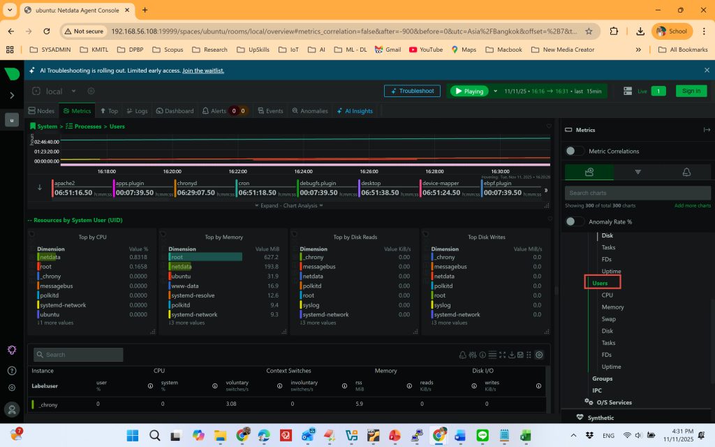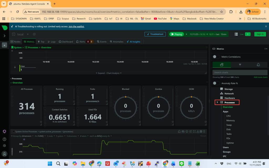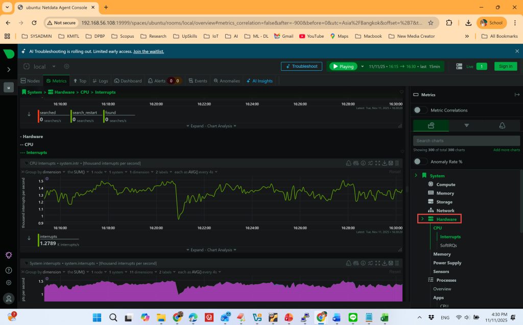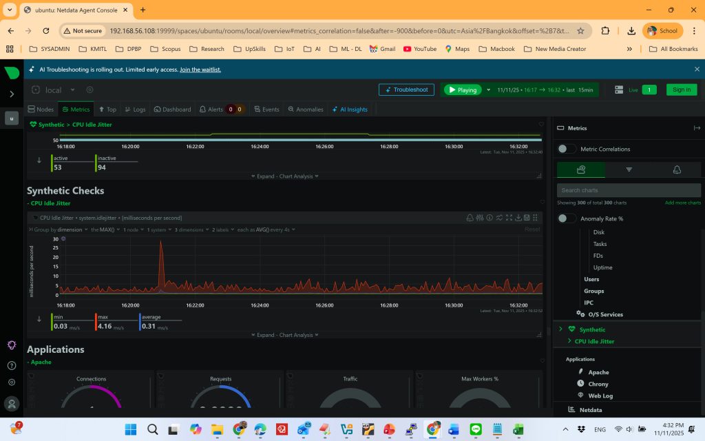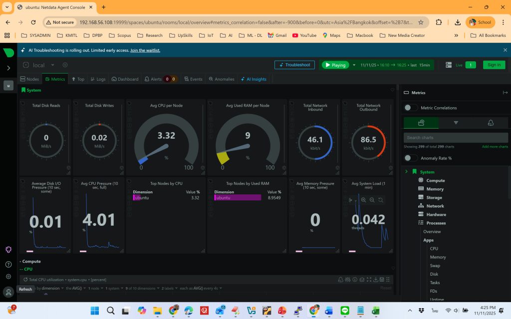หลังการติดตั้ง NetData จะเก็บและแสดงข้อมูลการทำงานของระบบในรูปแบบกราฟเรียลไทม์ เช่น: