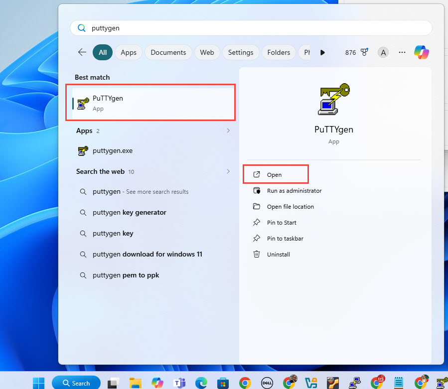 1. เปิดโปรแกรม PuTTYgen หรือเรียกใช้งานทาง Start (Start > พิมพ์ puttygen)