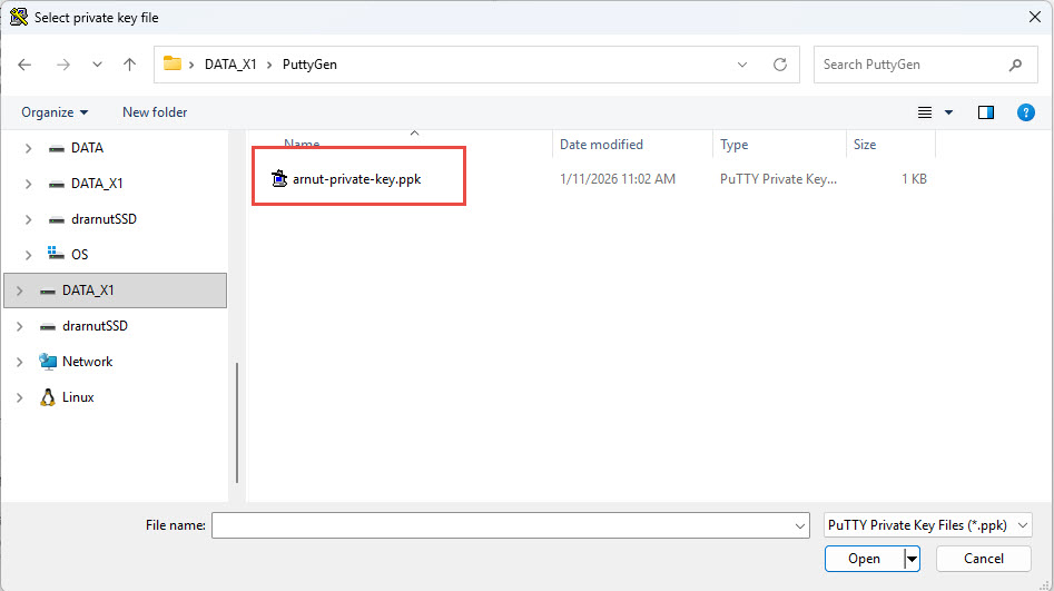 3. เลือกไฟล์ Private Key (.ppk) ที่คุณบันทึกไว้ในขั้นตอนแรก