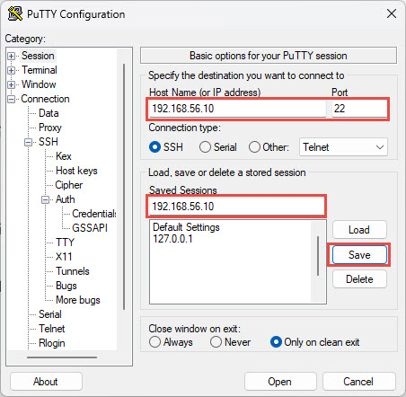 5. กลับไปที่หน้า Session ใส่ IP Address ของเซิร์ฟเวอร์ และ Save ชื่อโปรไฟล์ไว้