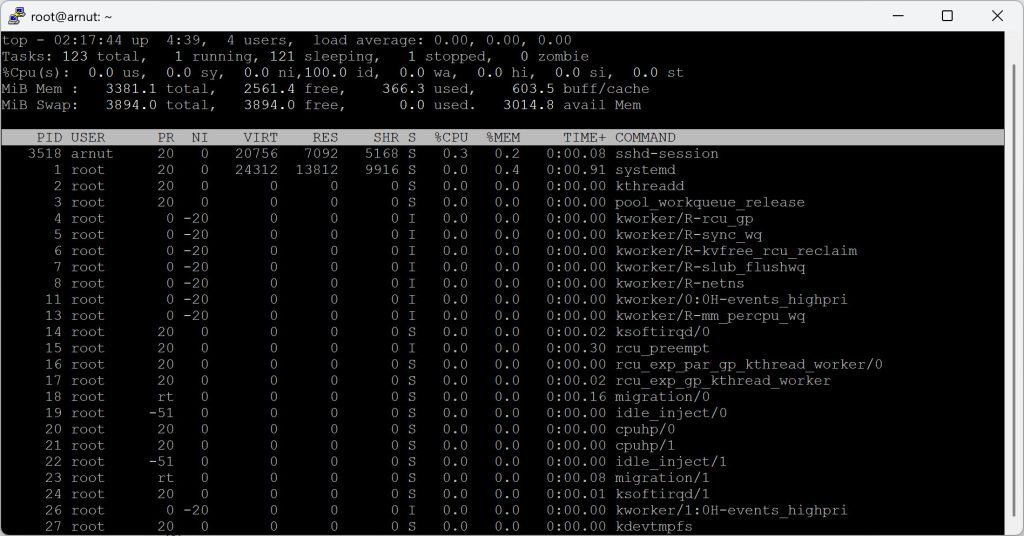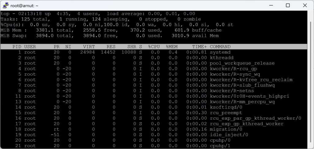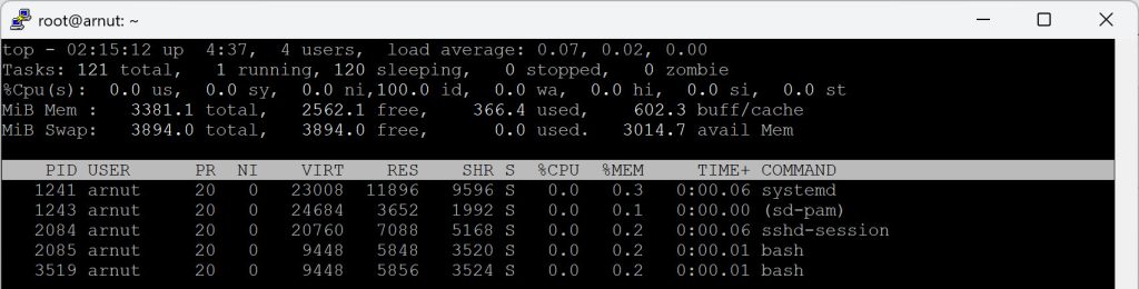 MiB Mem : 3381.1 total, 2558.5 free, 370.2 used, 601.9 buff/cache